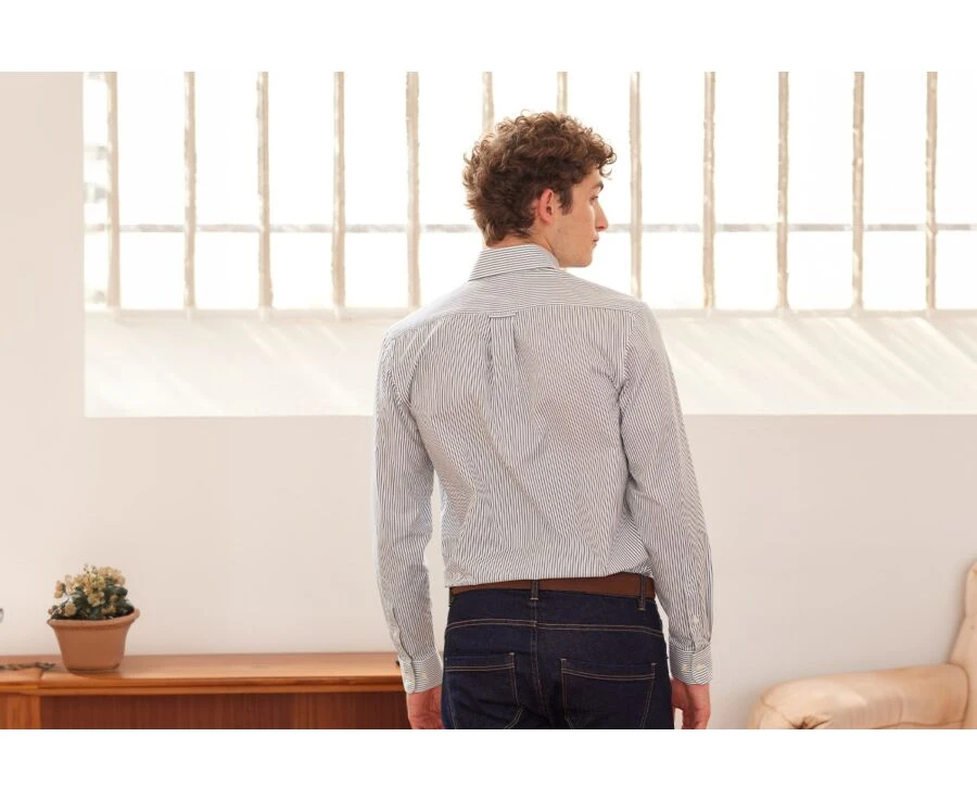 Une chemise manches longues avec un col américain, au dessin intemporel à porter de façon décontractée ou plus habillée selon les occasions.