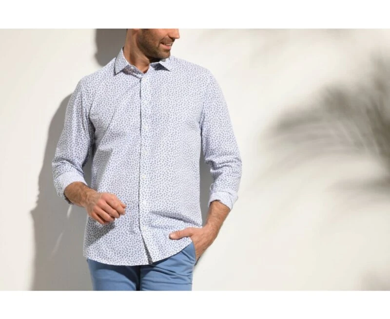 La chemise imprimée homme Mathurin Bleu et blanc est réalisée en popeline 100% coton 105g/m², avec une finition toucher doux.