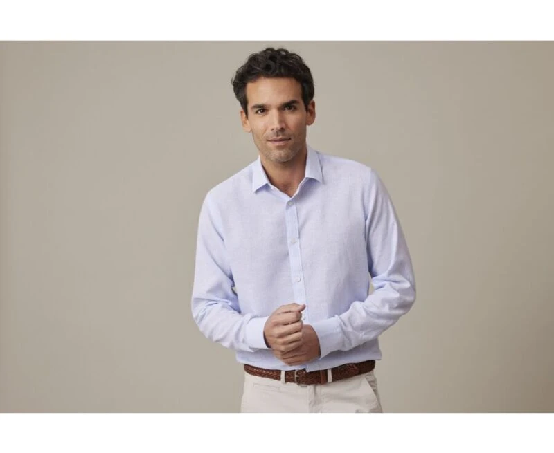 Une chemise homme lin et coton avec un col français, contemporaine, parfaite pour une tenue décontractée avec un pantalon chino ou un bermuda.