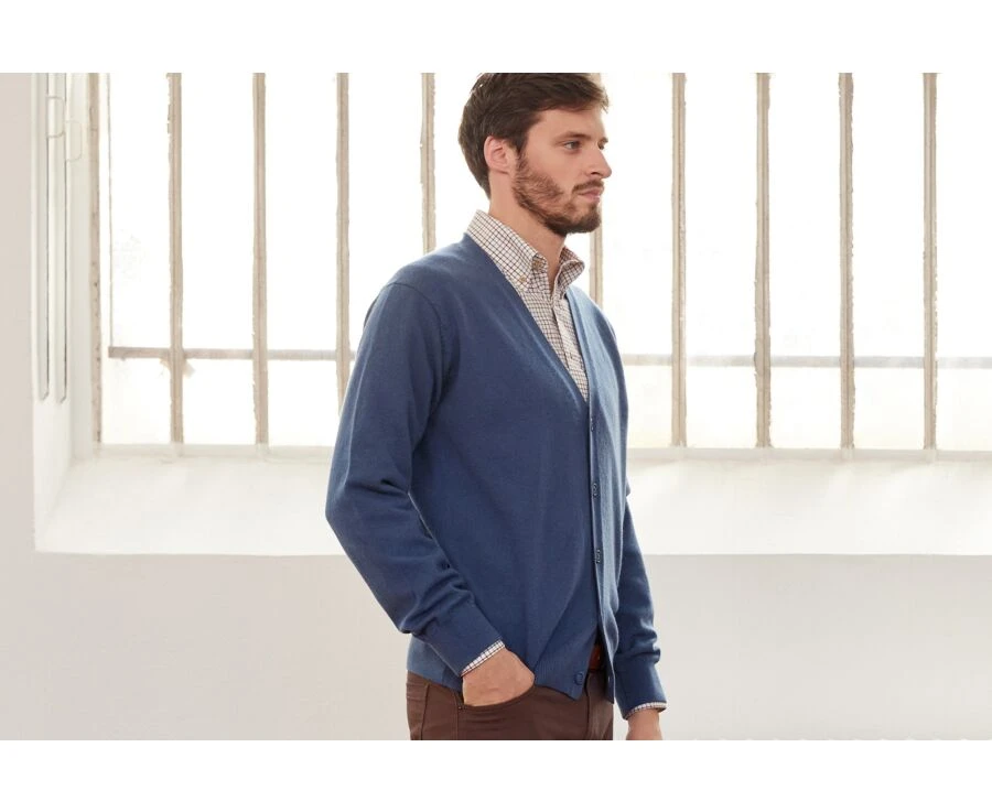 Tendance et chic, le cardigan Owen est réalisé en 100% Pur Lambswool Geelong avec coudières contrastantes en cuir. Le gilet Owen vous accompagnera simplement porté sur une chemise ou sous une veste de costume.