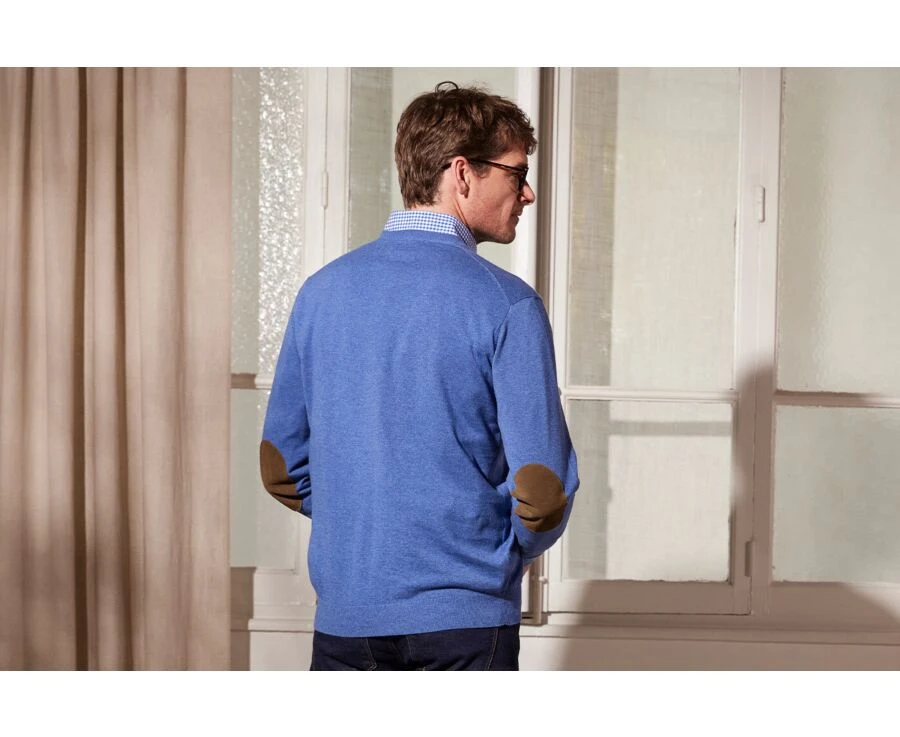 Idéal en toute saison, Vadim est un pull col V homme coupe standard, avec coudières contrastantes en 100% cuir véritable, pour un look ultra-chic.