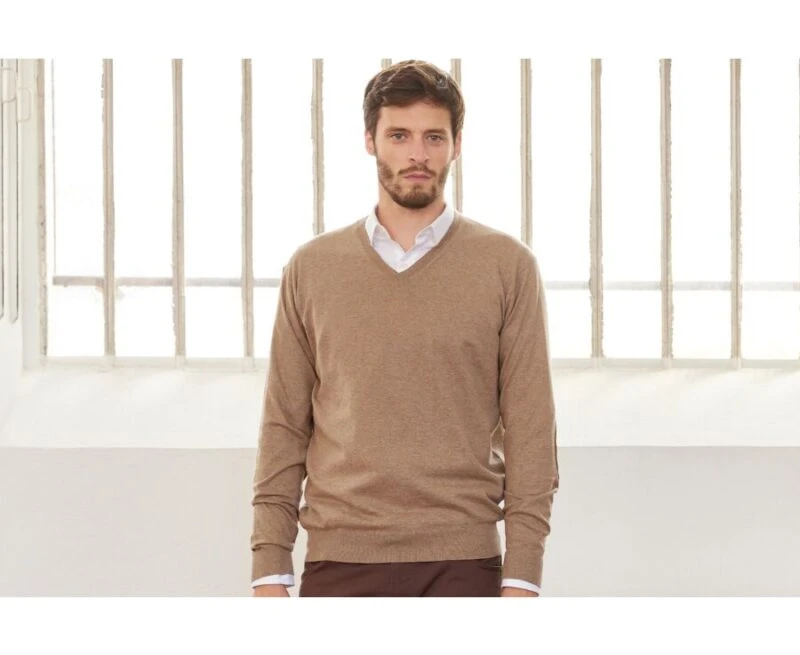 Pull Fin Homme Coton Bio/cachemire Col V Taupe Chiné – VADIM
