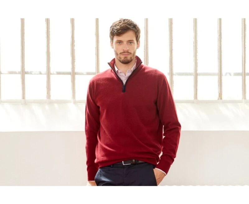 Le pull zippé homme Keithy avec passepoil et tirette en cuir vous accompagnera avec élégance. Idéal à porter avec une chemise.